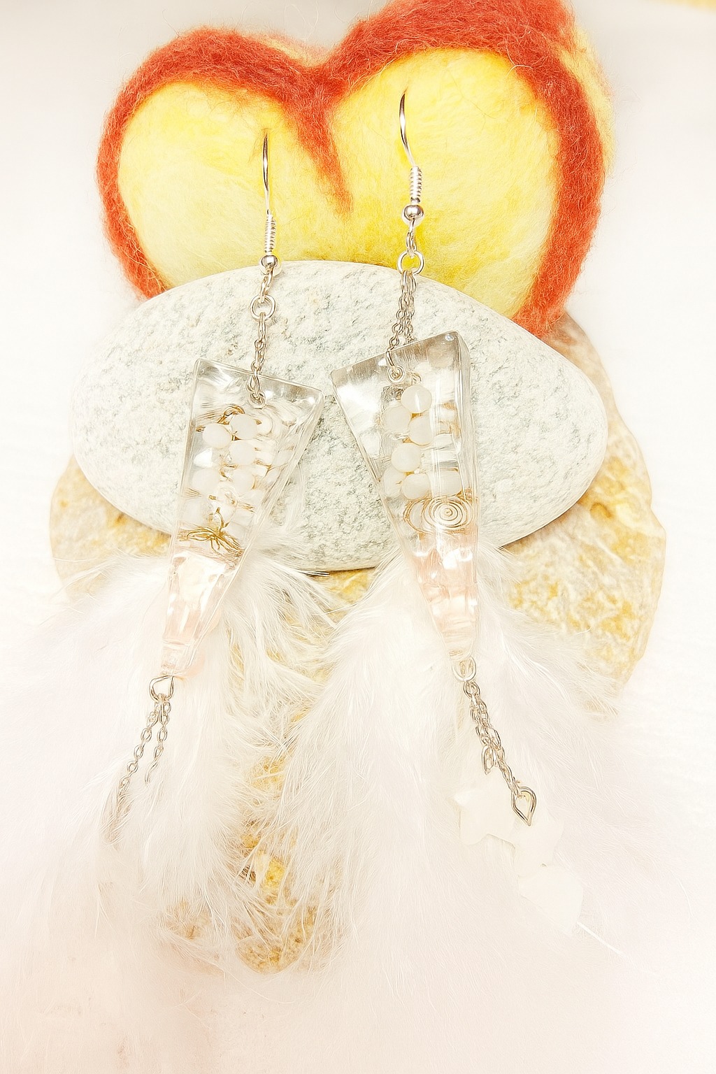 Estos pendientes artesanales combinan la pureza del blanco con destellos dorados, creando un amuleto de equilibrio y claridad interior.